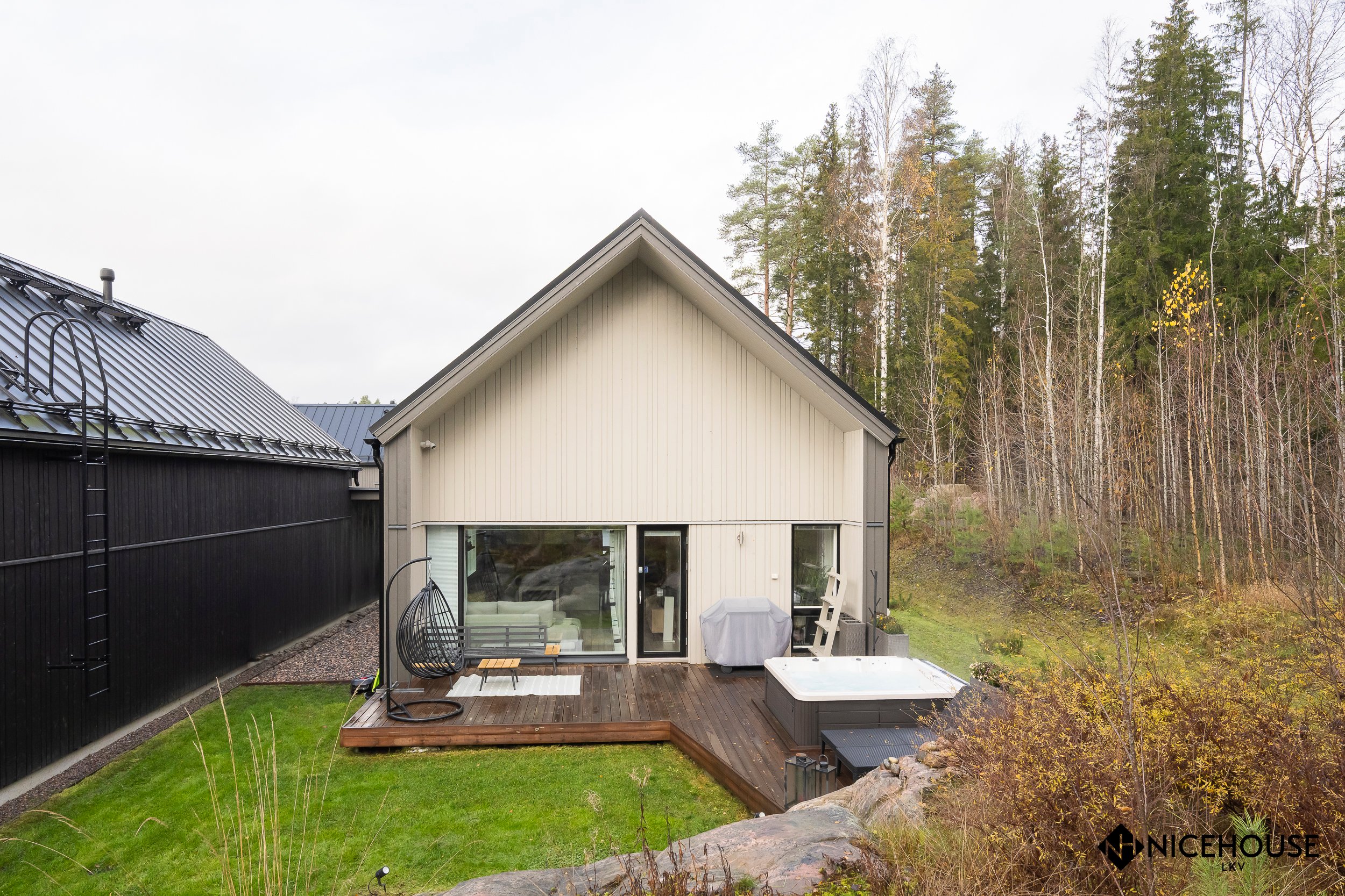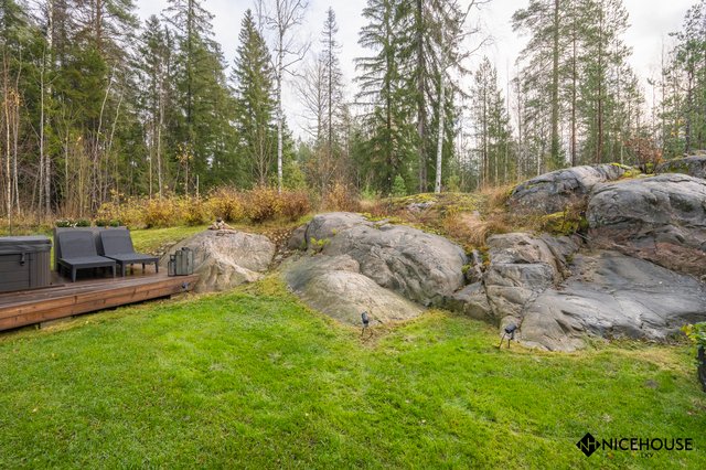 Moderni erillistalo, jonka suojaisa piha-alue rajoittuu kallioiseen metsään