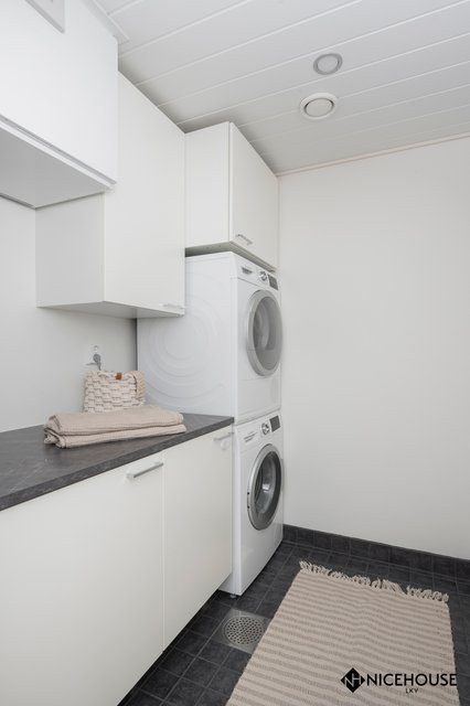 - Pesukoneliitäntä, pöytätaso, pyykkikaapit, ja tila pesutornille