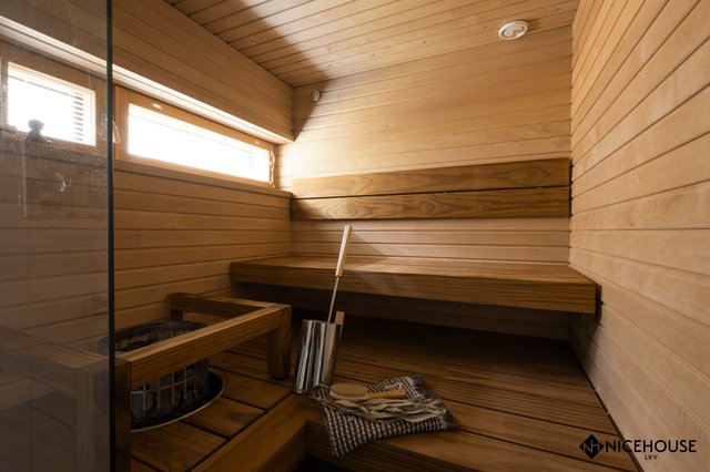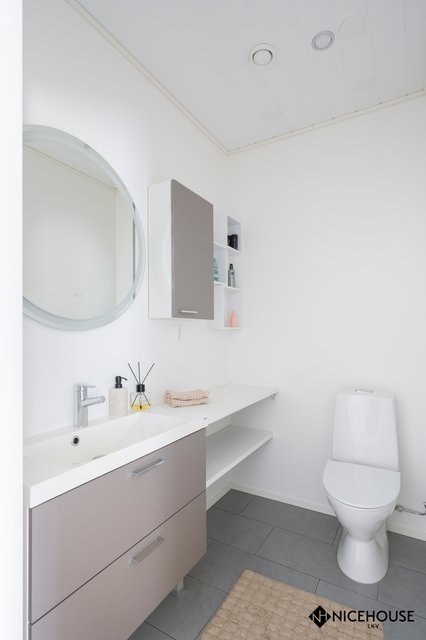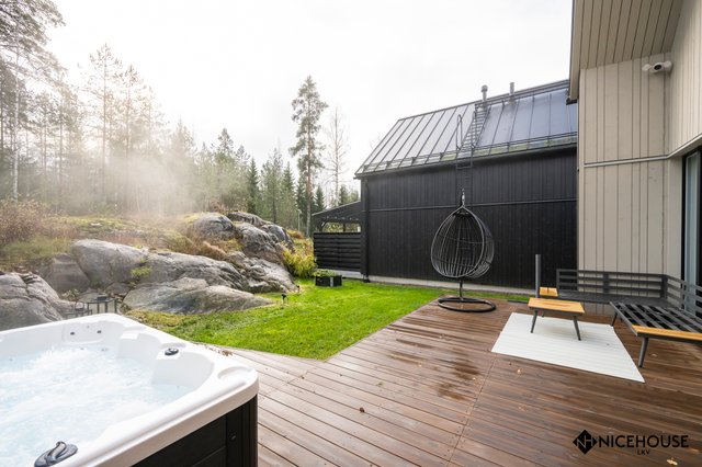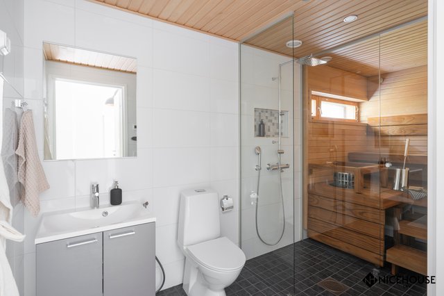 Tyylikäs sauna on varustettu lasiseinällä, mikä luo tilaan modernia ilmettä. Lisäksi tilavassa kylpyhuoneessa on kodin toinen wc. Erillinen wc sekä kodinhoitohuone tarjoavat arjen sujuvuutta. Terassilla sijaitseva ulkoporeallas on mukava lisä, ja se voidaan sisällyttää kauppaan ostajan toiveiden mukaan.