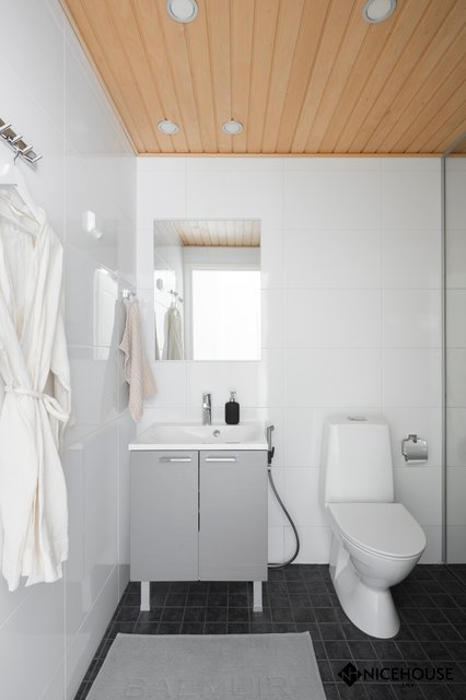 - WC-istuin, suihku, suihkuseinä, lattialämmitys, allaskaappi, bidee-suihku, pesuallas, ja peili