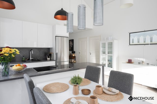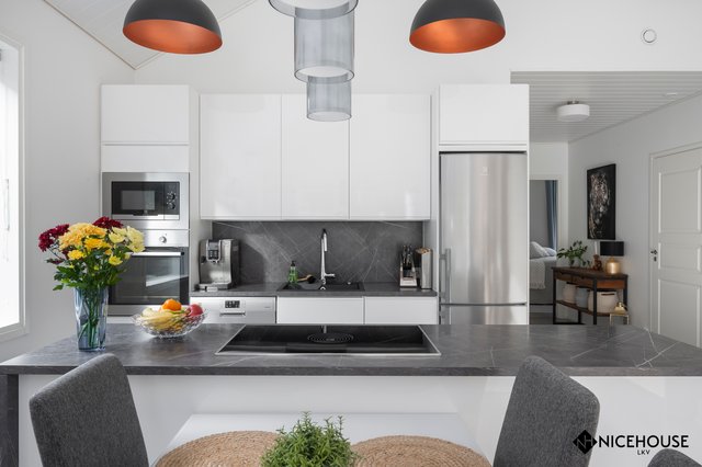 - Tyylikäs avokeittiö, johon on tehty rakennusaikaisina muutoksina mm. saareke