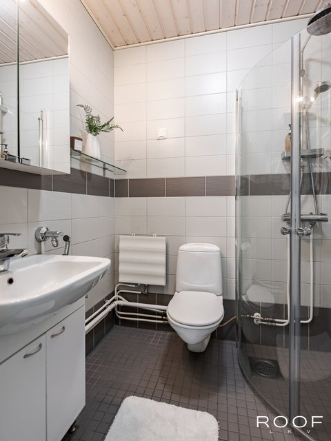- WC-istuin, suihku, pesukoneliitäntä, peilikaappi, allaskaappi, ja suihkuseinä