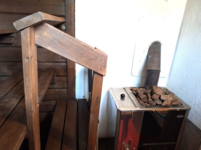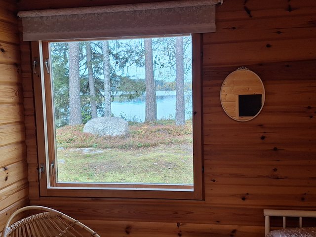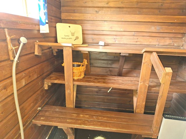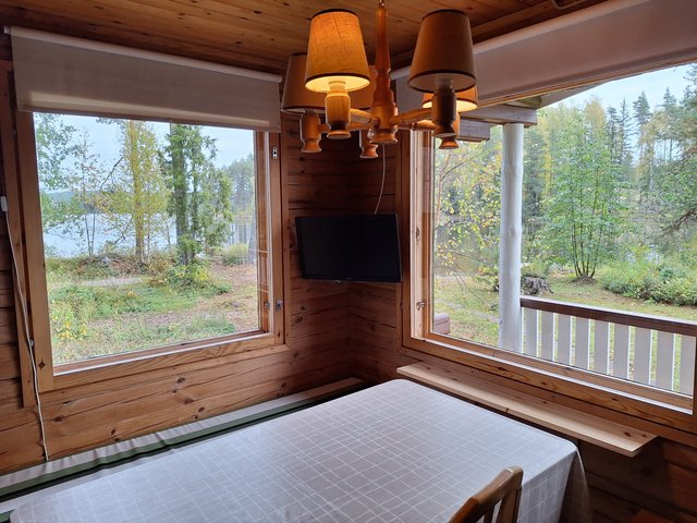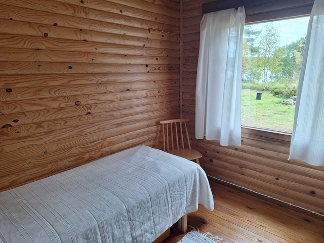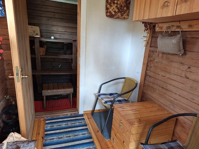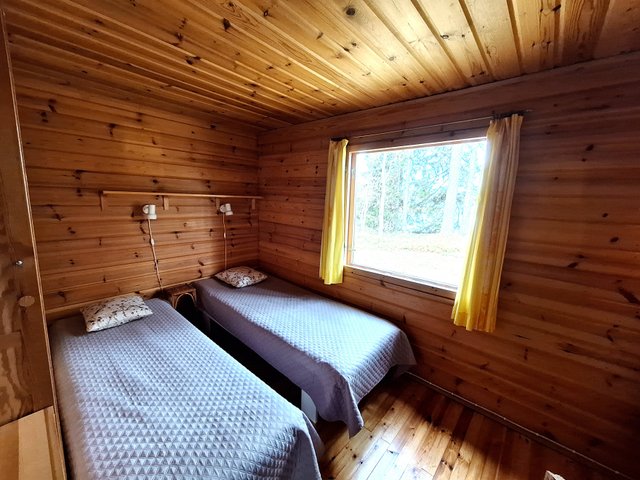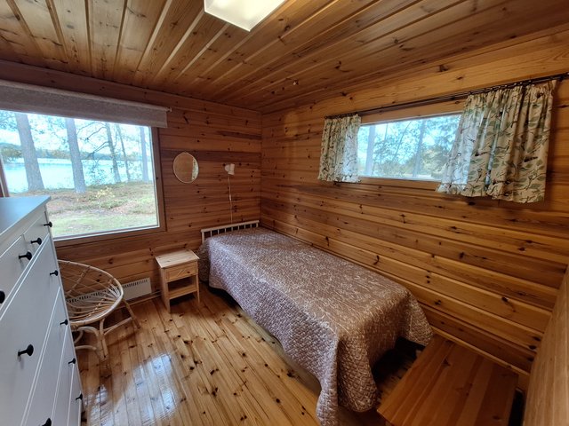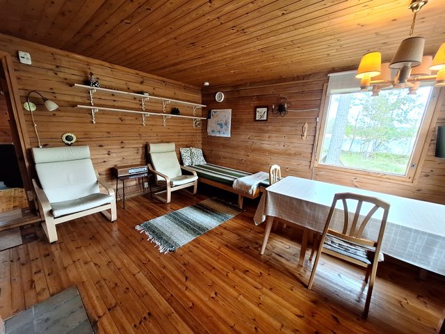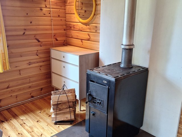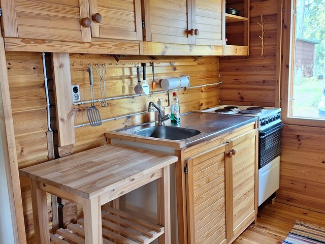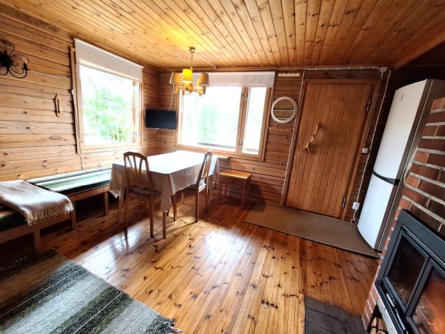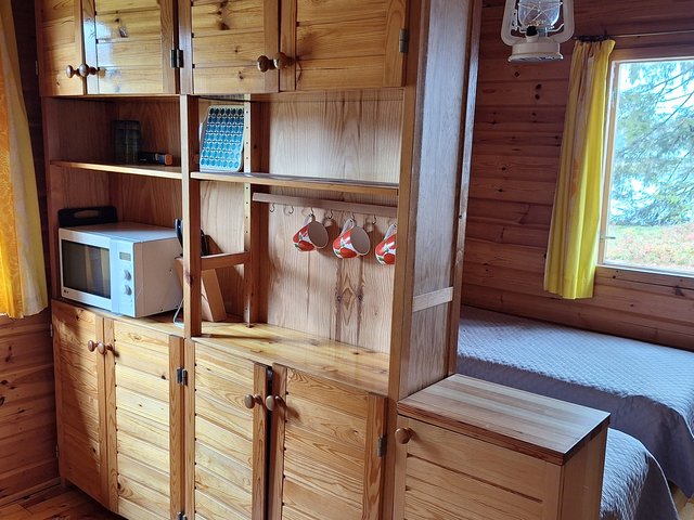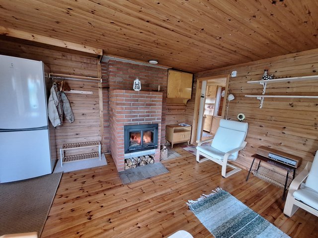 - Yksi erillinen makuuhuone ja lisäksi makuutila, joka erotettu kaapistolla keittiöstä. Tässä tilassa myös puukamiina.