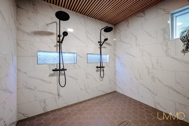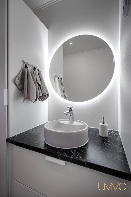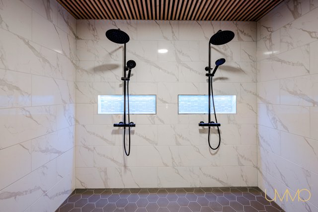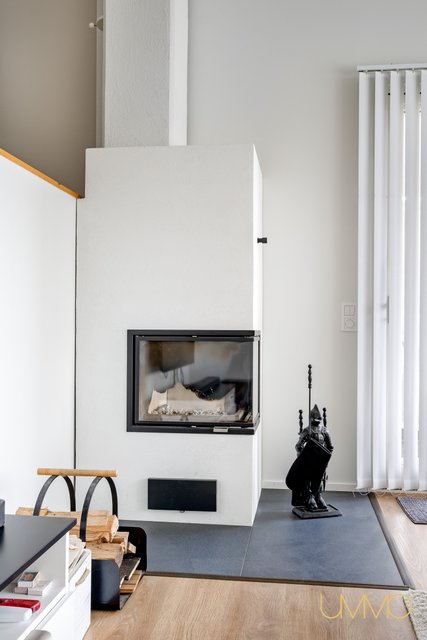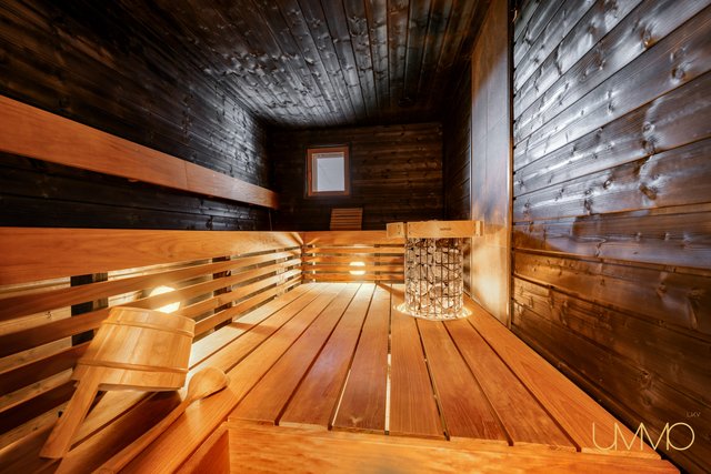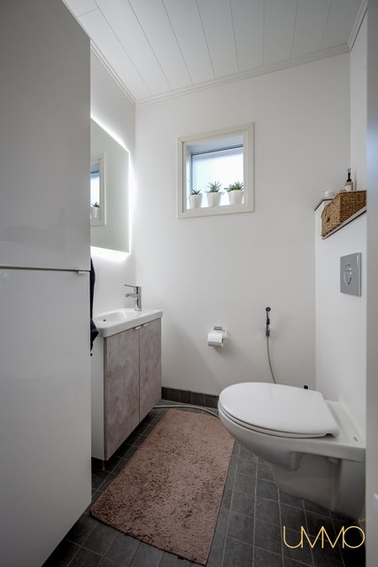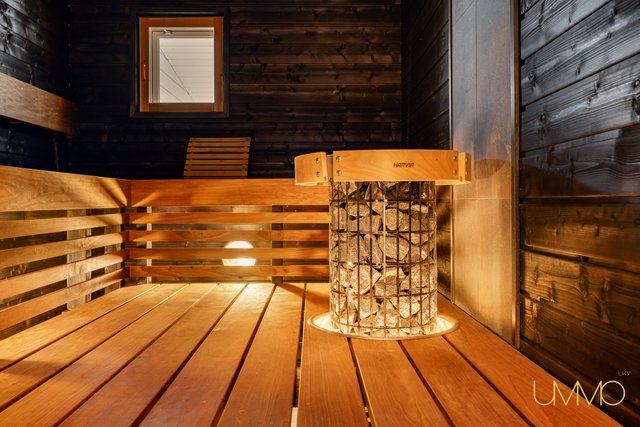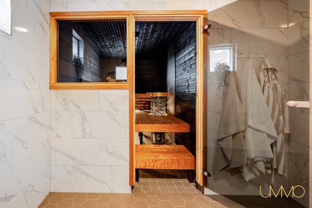 Laadukkaat ja aikaa kestävät pintamateriaalit viimeistelevät modernin ilmeen. Lämmitys hoituu energiatehokkaasti ilmavesilämpöpumpulla (Jäspi Tehowatti Air), joka on yhdistetty vesikiertoiseen lattialämmitykseen koko asuinrakennuksessa. Lisäksi varaava takka tuo tunnelmaa ja lämmönlähteen, ja ilmalämpöpumppu toimii tehokkaana lisäviilentäjänä kesähelteillä.