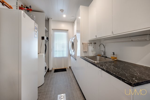 - Pesukone, kuivausrumpu, pesukoneliitäntä, lattialämmitys, lattiakaivo, pesuallas, ja pöytätaso
