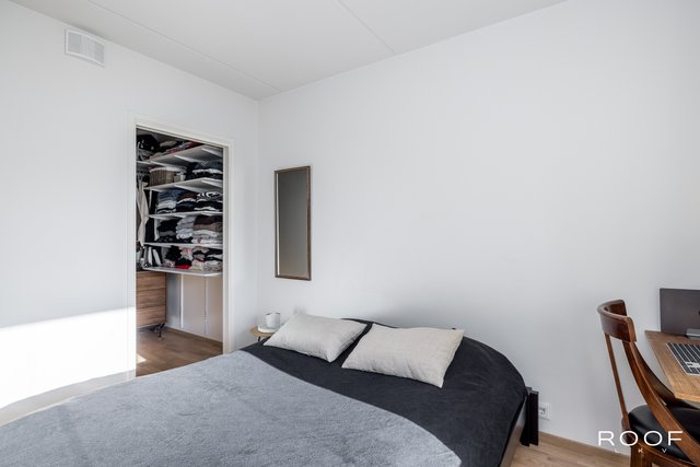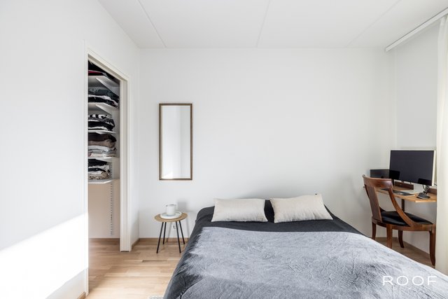 Selkeä pohjaratkaisu tekee arjesta sujuvaa: tilava makuuhuone kätkee sisäänsä oman vaatehuoneen, ja olohuone sekä keittiö muodostavat yhtenäisen, valoisan tilan. Ilmalämpöpumpun ansiosta sisäilma pysyy miellyttävänä myös helteisinä päivinä, ja vesikiertoinen lattialämmitys mahdollistaa vapaan kalustamisen ilman näkyviä pattereita.