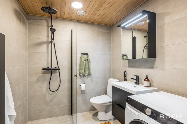 - WC-istuin, suihku (Sadesuihku), suihkuseinä, bidee-suihku, lattialämmitys, peilikaappi, pesuallas, allaskaappi, pesukoneliitäntä, ja pyykkikaappi