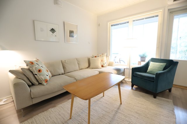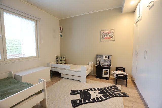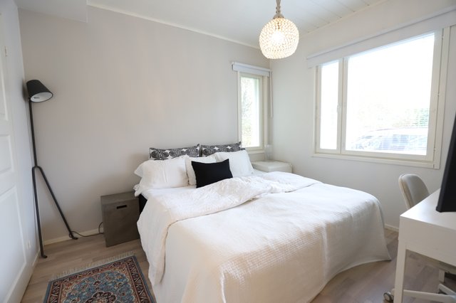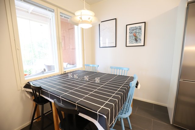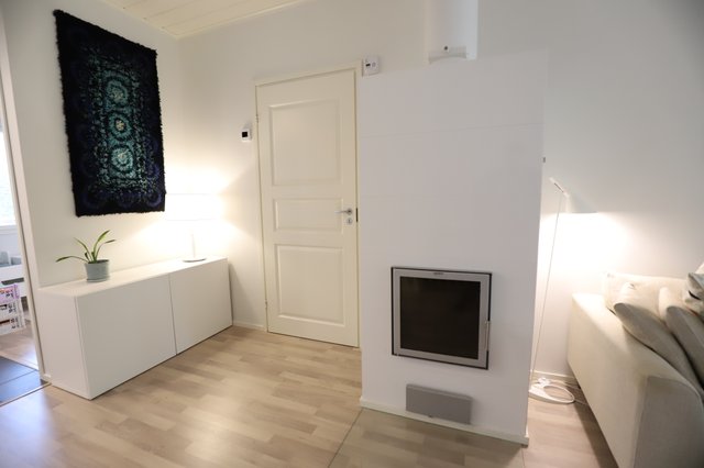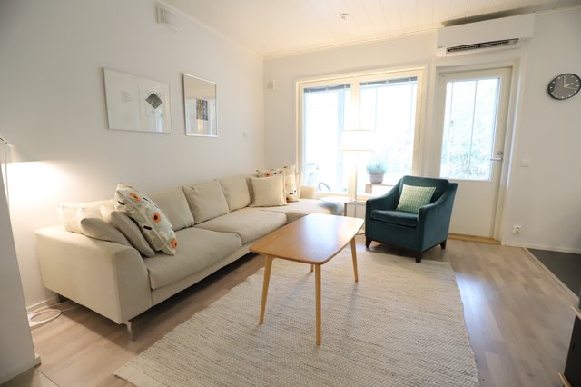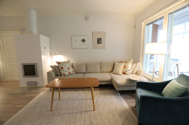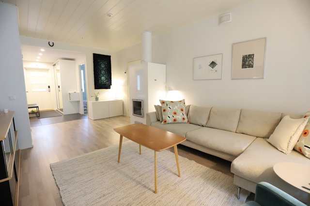 Kodin sydämenä toimii olohuoneen lämpöä varaava takka, joka luo kodikasta tunnelmaa. Keittiö on varusteltu nykyaikaisilla laitteilla, kuten induktioliedellä ja erillisellä uunilla. Kaksi makuuhuonetta tarjoavat mukavasti tilaa perheelle tai vieraille, ja sauna tarjoaa rentouttavat löylyt kiireisen päivän päätteeksi. Varustukseen kuuluu myös ilmalämpöpumppu.