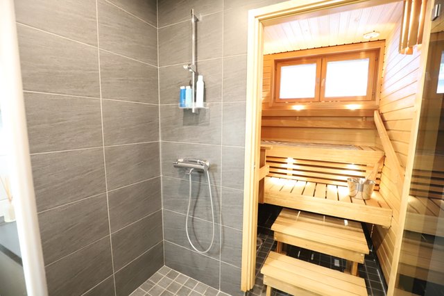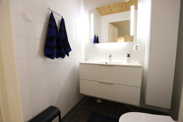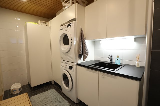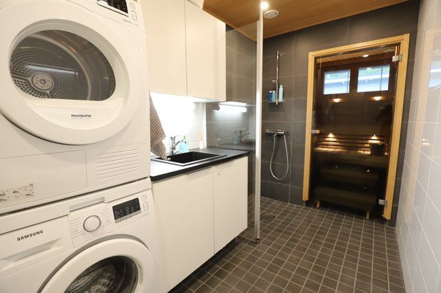 - Suihku, suihkuseinä, pesuallas, ja pesukoneliitäntä