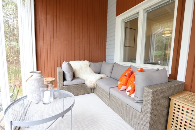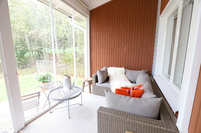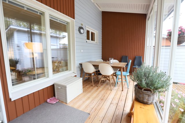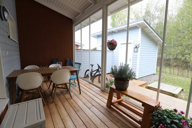 Tilava, lasitettu terassi on täydellinen paikka nauttia aamukahvista tai illallisesta ulkoilmassa. Säilytystilaa löytyy runsaasti vaatehuoneen, kaapistojen ja ulkovarastojen (lämmin ja kylmä) ansiosta. Asuntoon kuuluu myös autokatospaikka sekä piha-autopaikka.