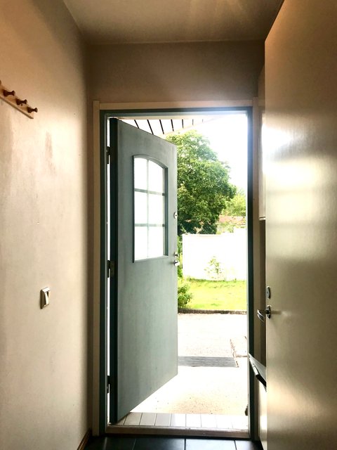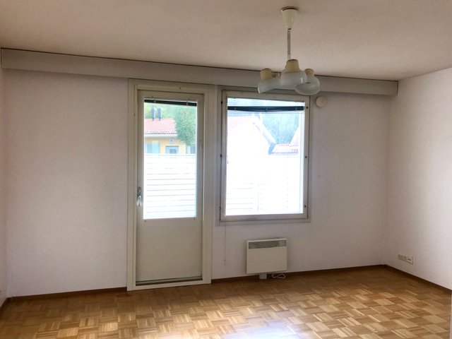 - Tilava olohuone, josta käyntiovi piha-alueelle. Seinämateriaalit: Maali Lattiamateriaalit: Kulunut sauvaparketti.