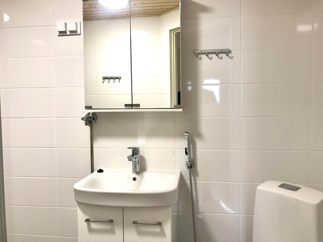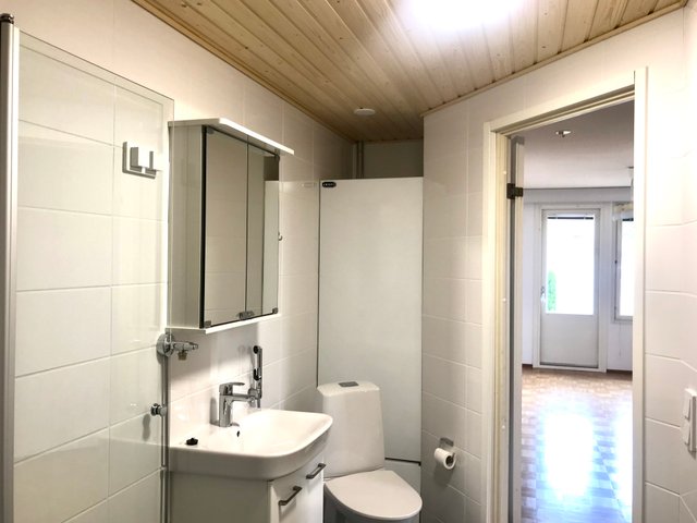 - Pesutila/wc uusittu 2024 yhtiön teettämän Märkätilasaneeraus erä 2:n yhteydessä. Varustus: Suihku. Suihkuseinä. Peilikaappi. Pesuallas. Allaskaappi. Wc-istuin. Varaus pesukoneelle. Sähköinen lattialämmitys. Seinämateriaalit: Laatta. Lattiamateriaalit: Laatta.