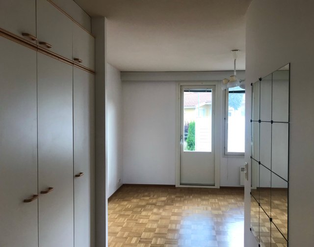- Tilava makuuhuone, jossa kaapisto. Seinämateriaalit: Maali. Lattiamateriaalit: Kulunut sauvaparketti.