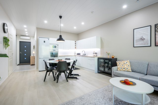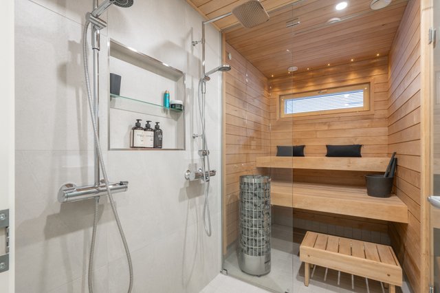 Asunnossa on laadukkaat materiaalit ja varusteet, kuten lattialämmitys ja koneellinen ilmanvaihto, jotka lisäävät asumismukavuutta. Oma sauna tarjoaa mahdollisuuden rentoutua kiireisen päivän jälkeen. Ulkona odottaa viihtyisä terassi, jossa voi nauttia kauniista kesäilloista.
