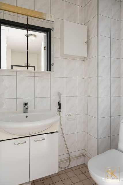 - VARUSTUS: wc-istuin, peilikaappi, pesuallas, hana, allaskaappi, bidee-suihku, lääkekaappi, lattialämmitys. SEINÄT/LATTIA: Laatta.