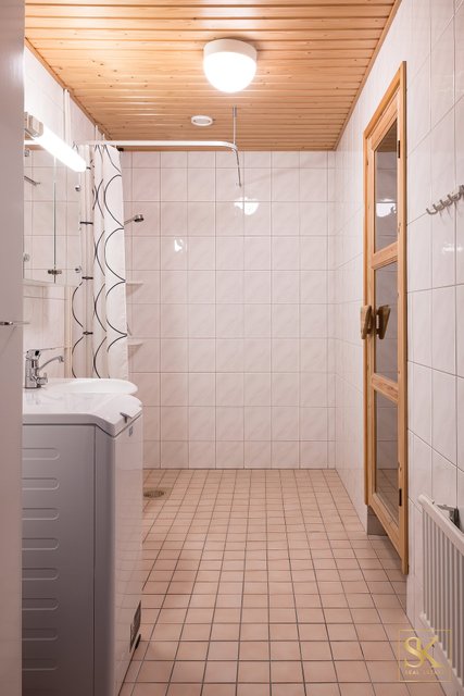 - VARUSTUS: Suihku, suihkuverho, pesuallas, allaskaappi, peilikaappi valaisimella, pesuhana, pesukoneliitäntä, lattialämmitys. SEINÄT / LATTIA: Laatta.