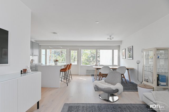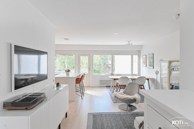- Olohuone on valoisa ja avara, jossa isot ikkunat tuo vehreää maisemaa. Lattiana moderni tammiparketti (uusittu v. 2021).