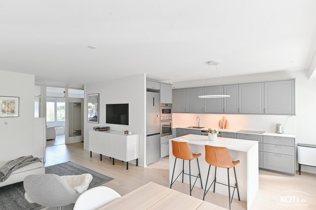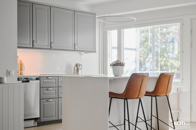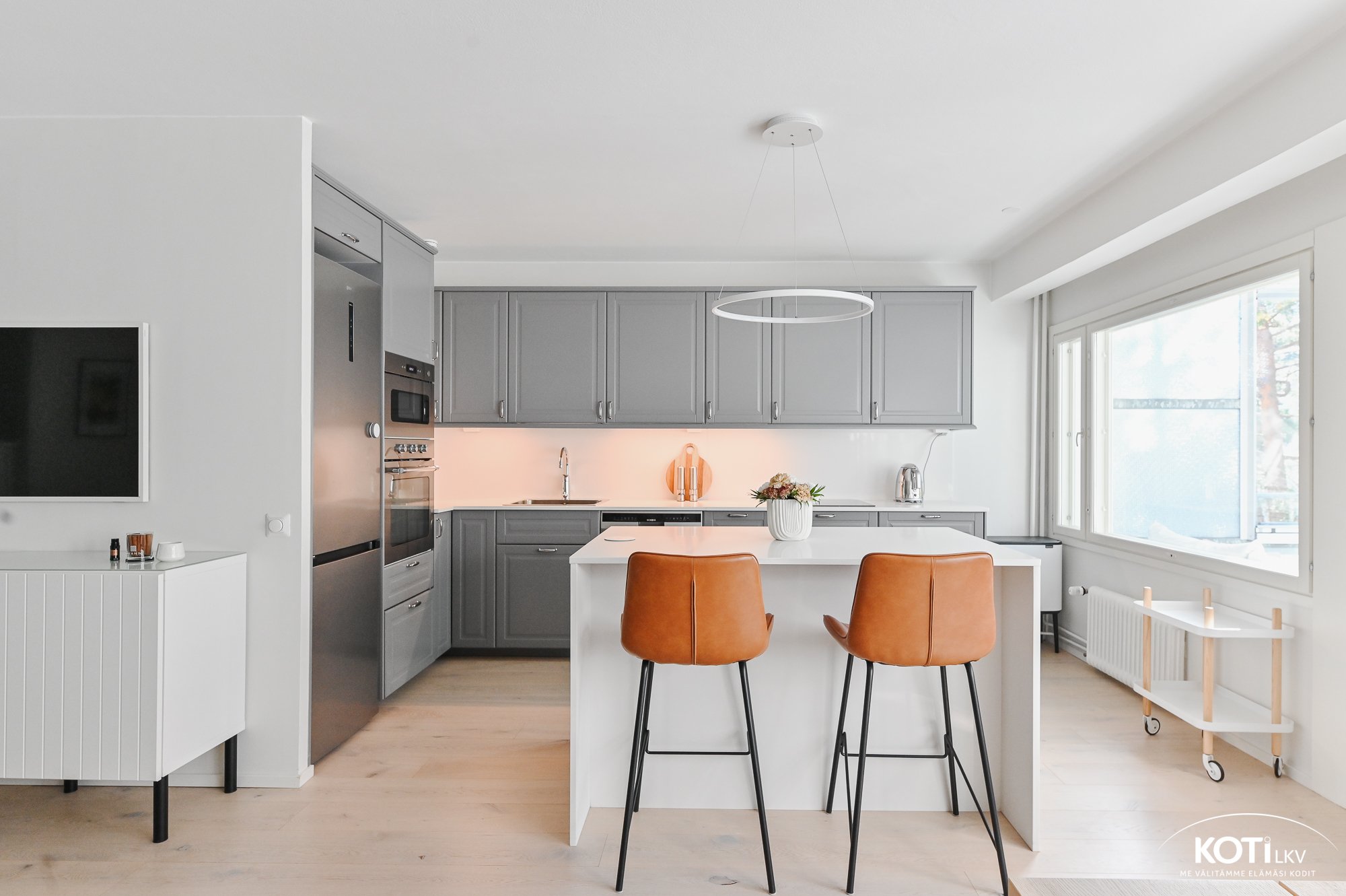 - Avokeittiö uusittu modernein sävyin vuonna 2021, jossa saarekkeesssa myös hyvin säilytystilaa.