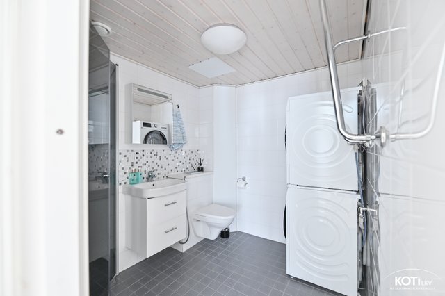 - Kylpyhuone on tilava, johon mahtuu hyvin pesutorni. Uusittu linjasaneerauksen yhteydessä 2012 vaaleilla sävyillä ja ovi vaihdettu 2021.