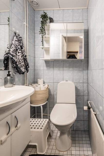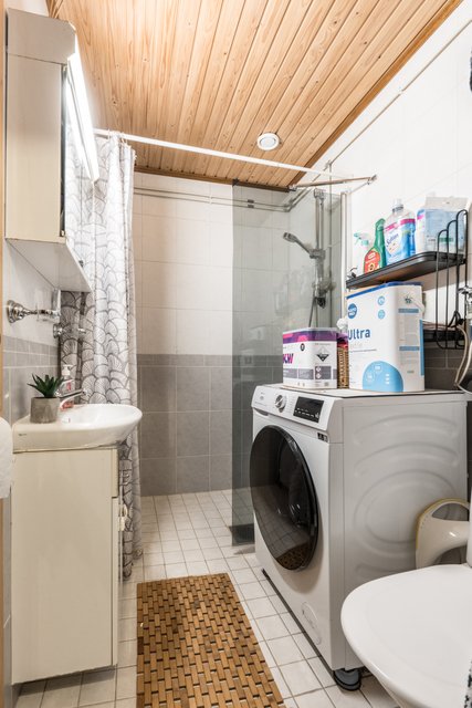 - Silppuava wc (Grundfos Sololift), suihku, pesukoneliitäntä, peilikaappi, bidee-suihku, suihkuseinä, ja allaskaappi