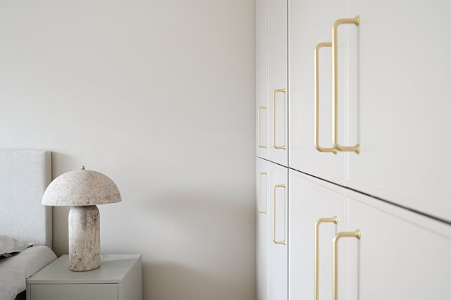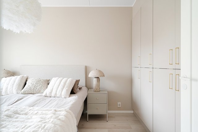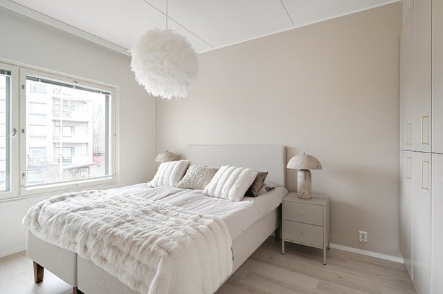 Tilavan makuuhuoneen kaapistoihin ja tehosteseinään on valittu lämpimiä beigen sävyjä. Makuuhuoneen kohdalla ei ole seinänaapureita ja oma rauha on taattu.