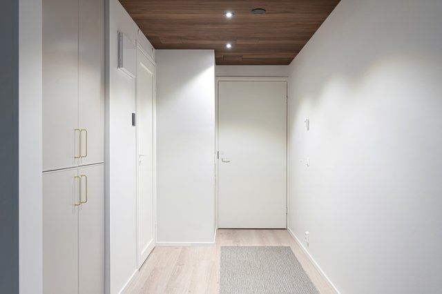 - Avara ja tilava eteinen. Eteisessä on kiinteä kaapisto. Katossa ThermoRoyal rimapaneeli ja upotetut led valot.