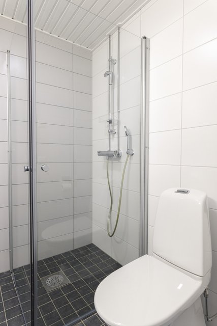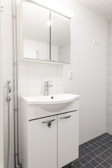 - suihku, suihkukaappi, peilikaappi, pesuallas, allaskaapisto, pesukoneliitäntä, lattilämmitys, kiinteät valaisimet