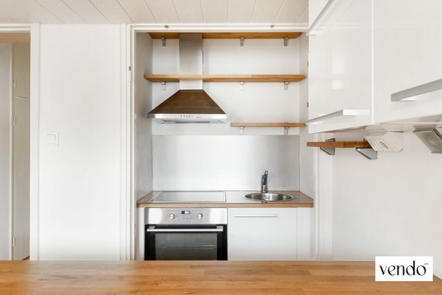 Keittotilassa on kaikki olennainen kompaktiin tilaan suunniteltuna ja saareke tuo lisää lasku- sekä säilytystilaa.