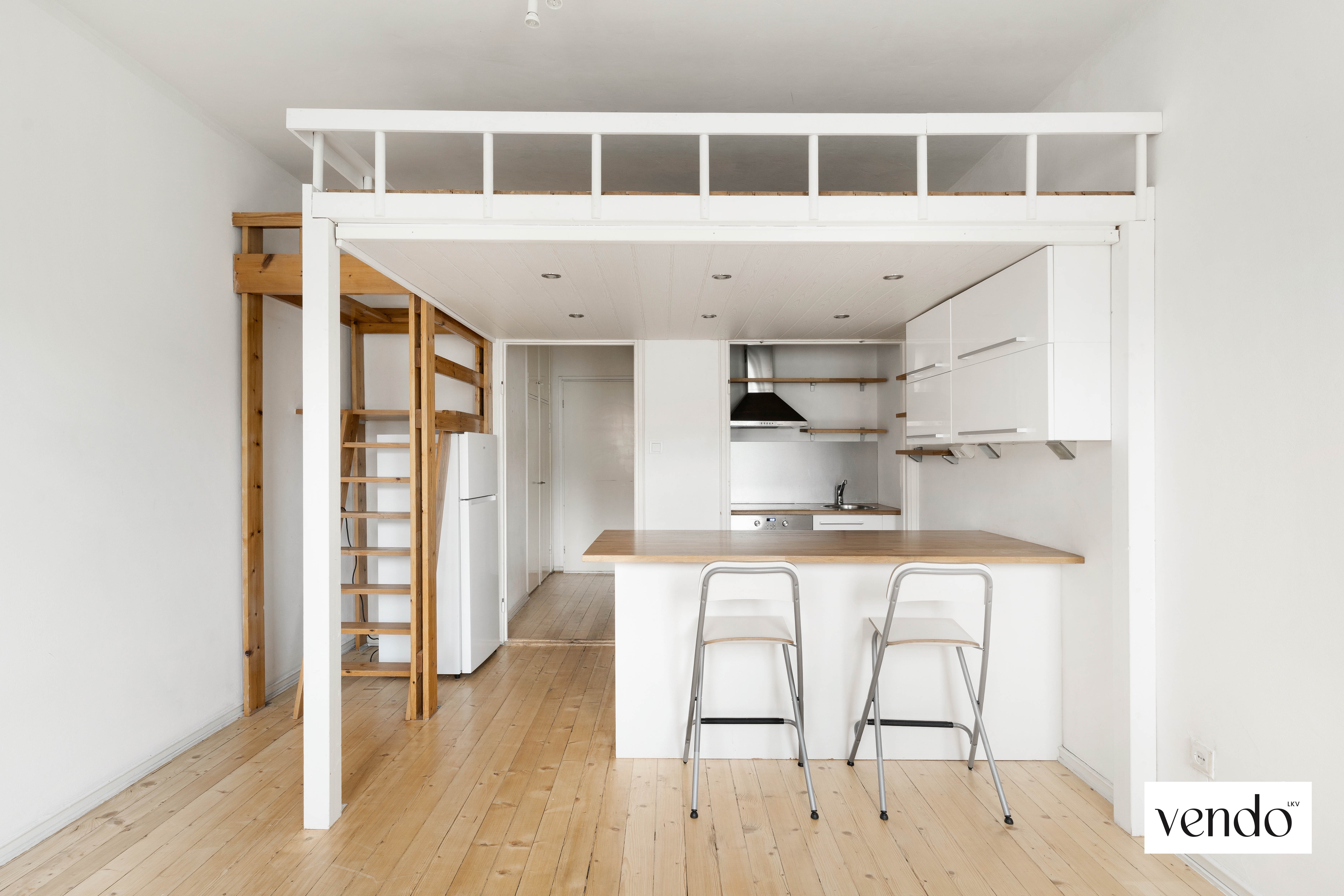 Asunnon tilava parvi tuo käytännöllisesti lisäneliöitä arkeen, sinne mahtuu helposti leveäkin parisänky, ja alapuolelle jää runsaasti tilaa olohuoneelle tai työskentelypisteelle.