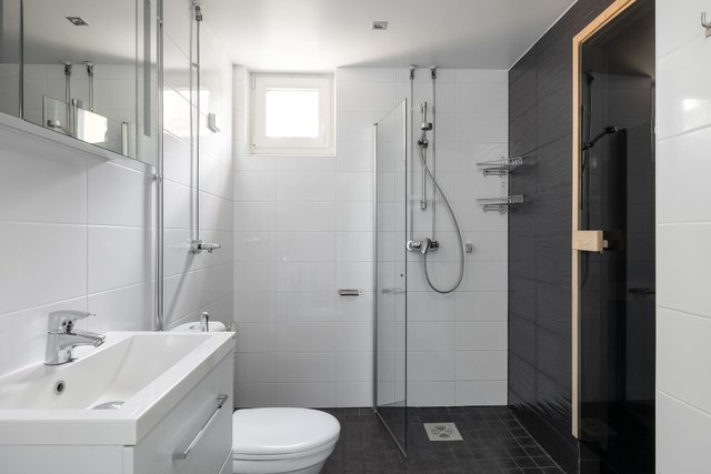 - WC-istuin, suihku, suihkuseinä, pesukoneliitäntä, lattialämmitys, peilikaappi, pesuallas, allaskaappi, ja bidee-suihku