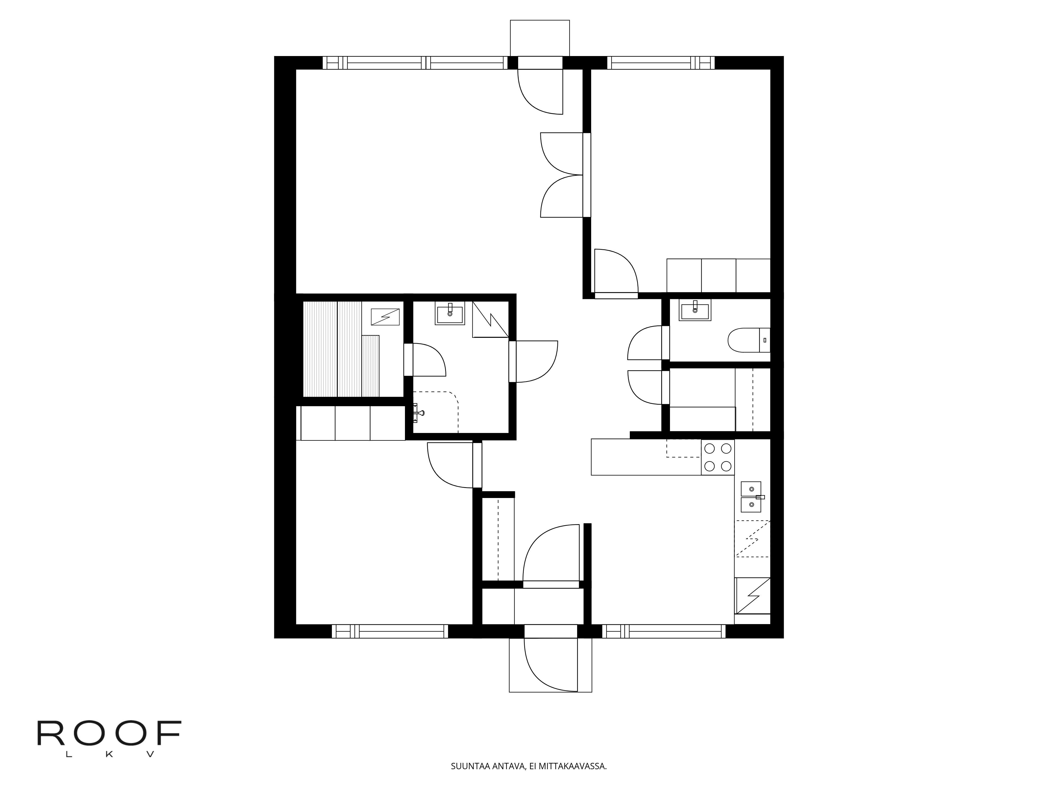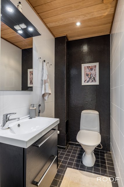 - Suihku, pesukoneliitäntä, pesuallas, allaskaappi, peili, kuivauspatteri, ja lattialämmitys