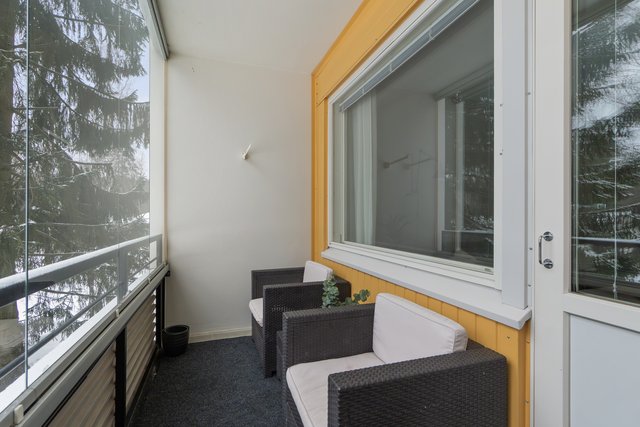- Tilava olohuone, josta kulku lasitetulle parvekkeelle.
