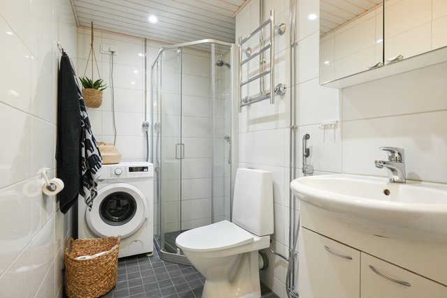 - WC-istuin, suihku, suihkuseinä, lattialämmitys, bidee-suihku, pesukoneliitäntä, peilikaappi, ja allaskaappi