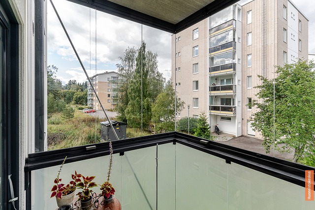 - Lasitettu parveke, näkymät osin taloja, osin avaraa piha-aluetta, talon vieressä tällä hetkellä rakentamaton tontti, johon rakennetaan lähitulevaisuudessa.