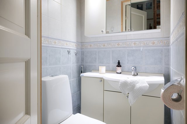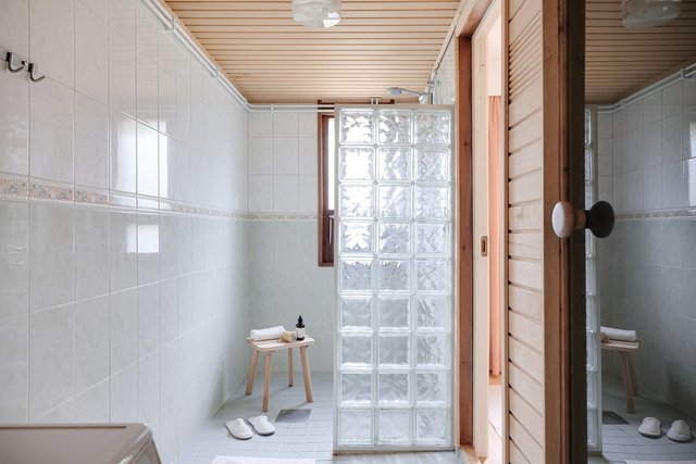 - Suihku, suihkuseinä (Lasitiili suihkuseinä), lattialämmitys (sähköinen), ja pesukoneliitäntä