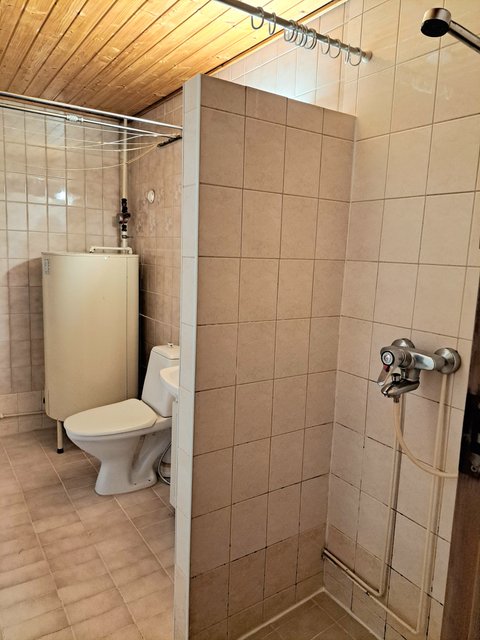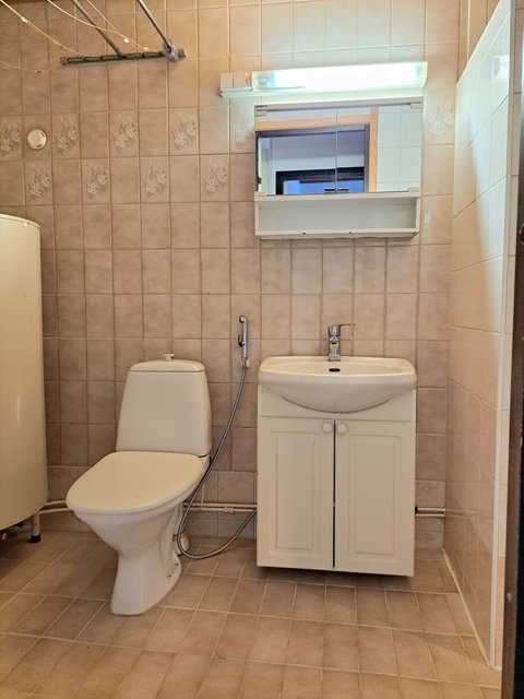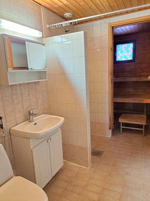 - Suihkuseinä, suihku, wc-istuin, pesukoneliitäntä, lattialämmitys, allaskaappi, pesuallas, peilikaappi, ja bidee-suihku