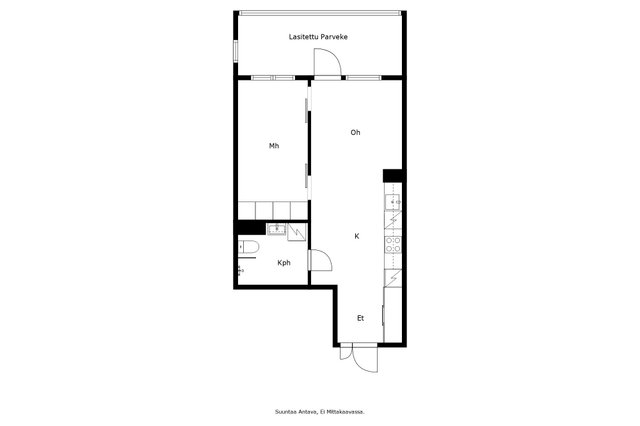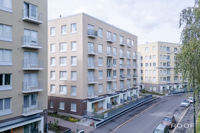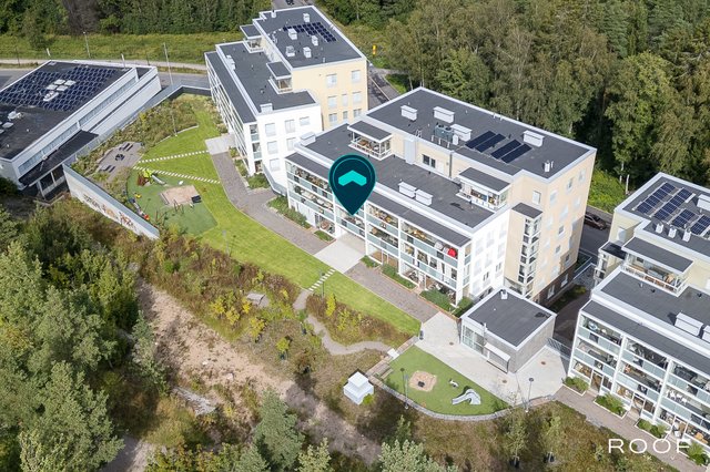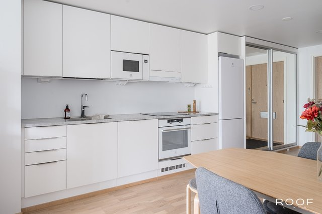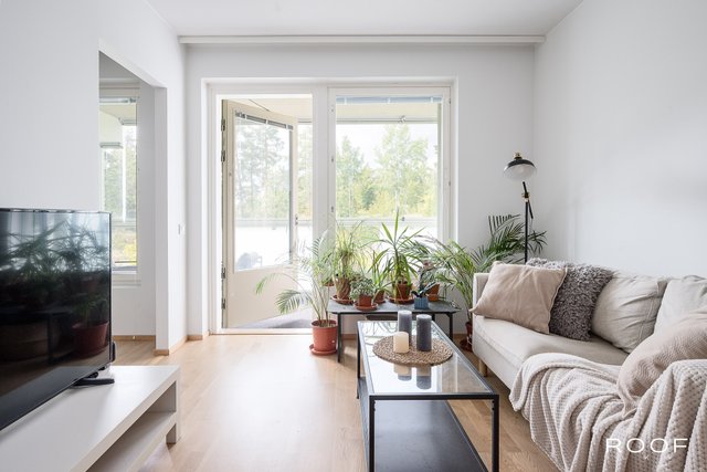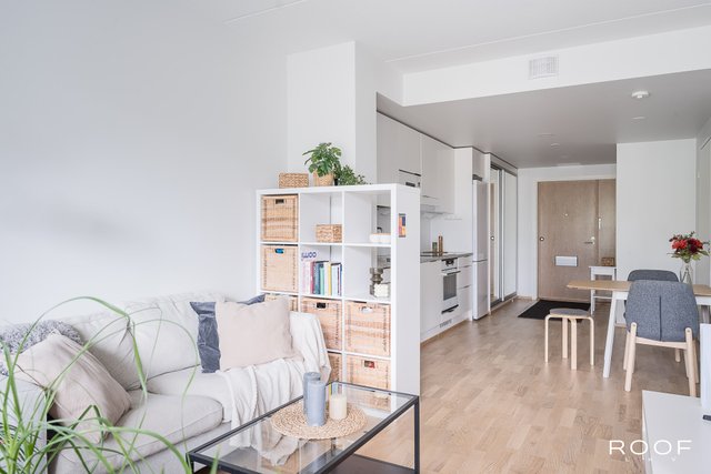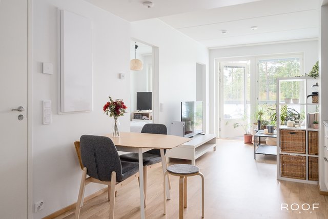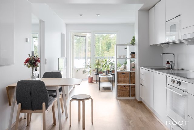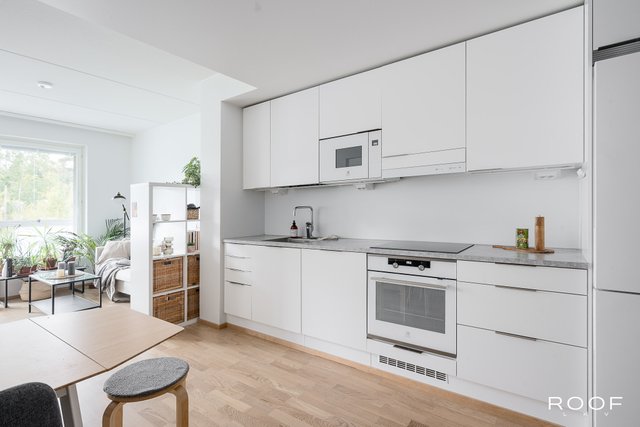 Tämä valoisaan ja moderniin 42 neliön kerrostalokotiin on suunniteltu kaikki arjen mukavuudet huolella. Avoin keittiö yhdistyy saumattomasti olohuoneeseen, josta on käynti koko huoneiston levyiselle lasitetulle parvekkeelle. Parvekkeelta aukeavat rauhoittavat näkymät yhtiön kauniille sisäpihalle, ja suurten ikkunoiden ansiosta koti kylpee luonnonvalossa. Parveke toimii lähes ympäri vuoden lisähuoneena, ja käytännöllinen kylpyhuone pyykkihuollon tiloineen tekee arjesta sujuvaa ja vaivatonta.