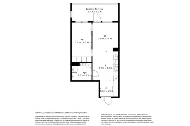 - Yhtiöjärjestyksen mukainen, Isännöitsijäntodistuksen mukainen, (Pinta-ala ei ole tarkistusmitattu ja todellinen pinta-ala voi olla suurempi tai pienempi, kuin ilmoitettu)
