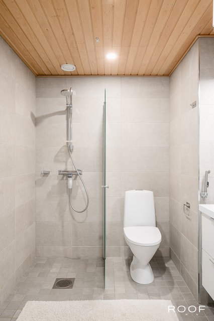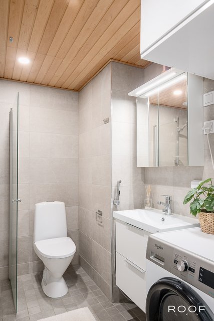- WC-istuin, bidee-suihku, suihku, suihkuseinä, peilikaappi, pesuallas, allaskaappi, lattialämmitys, ja pesukoneliitäntä