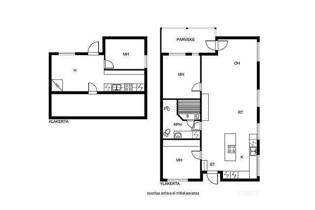 - Yläkerta noin 100m² ja alakerta mihin oma sisäänkäynti n. 47m² Pinta-alaa ei ole tarkistusmitattu ja ne voivat poiketa olennaisestikin nykymääräysten mukaan mitattavista pinta-aloista.