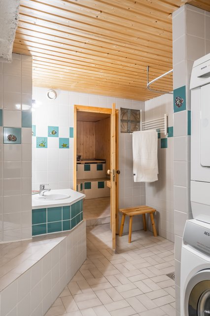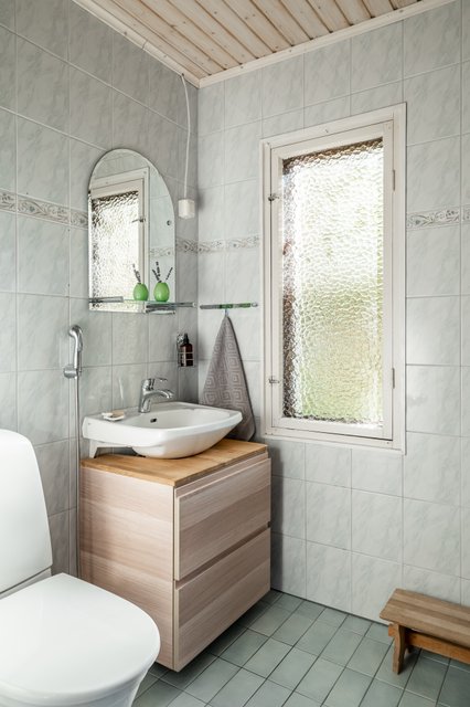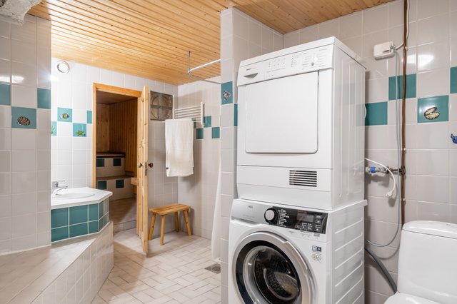 - Suihkuseinä, kylpyamme, peili, allaskaappi, pesukoneliitäntä, ja lattialämmitys