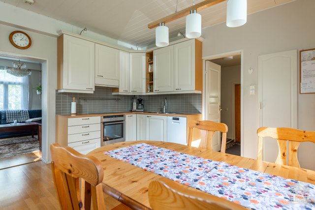 4h, keittiö, 2 x erill. wc, sauna/kph, eteinen, aula, vanha sauna, puuliiteri ja autotallirakennus.