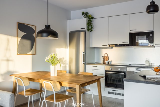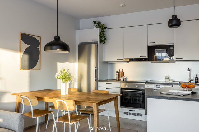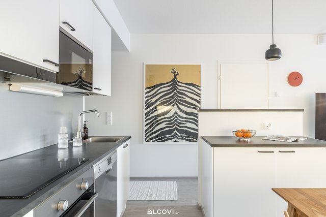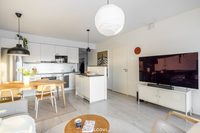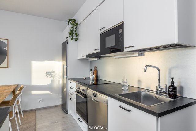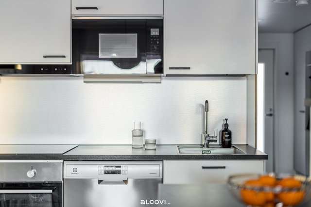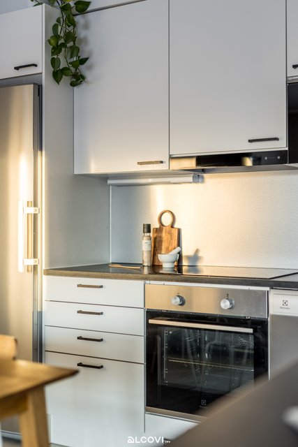 - Avokeittiön varustukseen kuuluvat integroidut kodinkoneet: keraaminen liesitaso, kalusteuuni, liesituuletin, jääkaappi-pakastin, mikroaaltouuni ja astianpesukone. Lattia on laminaattia, seinät maalatut. Lattialämmitys (vesikiertoinen).