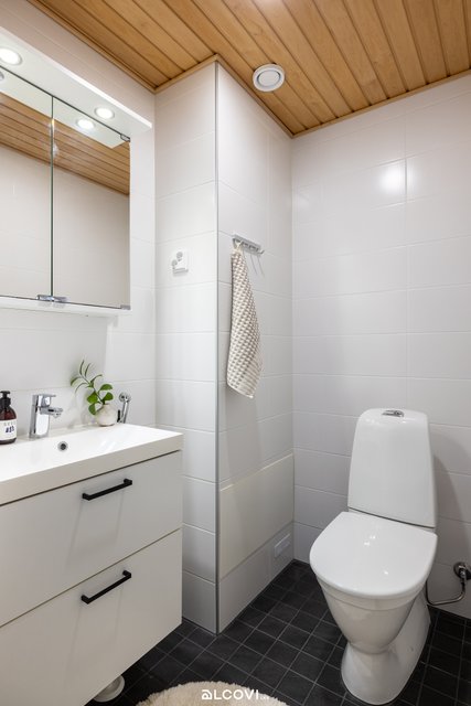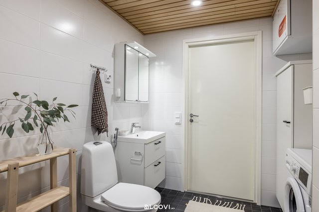 - Kylpyhuoneen varustukseen kuuluu allaskaappi, valaistu peilikaappi, seinäkaappi, suihku, lasinen suihkuseinä, pyykinpesukoneliitäntä, tilavaraus pesutornille, wc-istuin, bidee-suihku, pyyhekoukut ja lattialämmitys (vesikiertoinen). Lattia on laattaa, seinät kaakelia ja katto paneloitu. Tuuletusikkuna ulos.