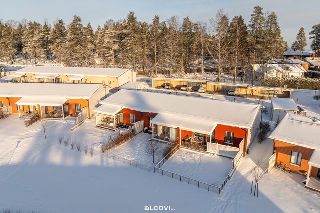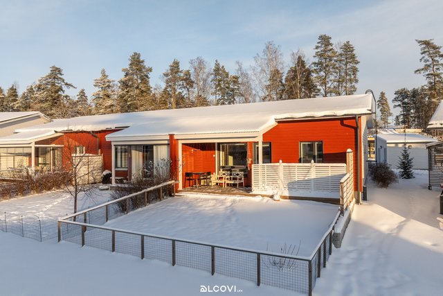 sijoittuvalle terassille ja nurmella viimeistellylle aidatulle piha-alueelle. Tilavalla terassilla viihdyt katoksen ansiosta myös sadekeleillä. Ilmalämpöpumppu takaa asumismukavuuden myös kesähelteillä! Kiintokaapistoin varusteltuja makuuhuoneita on kolme, ja ne taipuvat monenlaiseen tarpeeseen. Ajattomin sävyin ja toimivin säilytysratkaisuin viimeistelty kylpyhuone pitää sisällään tilansa myös pyykkihuoltoon. Oma sauna viimeistelee arjen mukavuuden! Laatoitetun eteisen yhteydestä löytyy käytännöllisesti tämän kodin toinen wc.