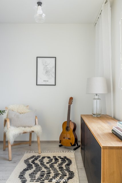 - Olohuoneen lattia on laminaattia, seinät maalatut. Lattialämmitys (vesikiertoinen). Kulku katetulle terassille.