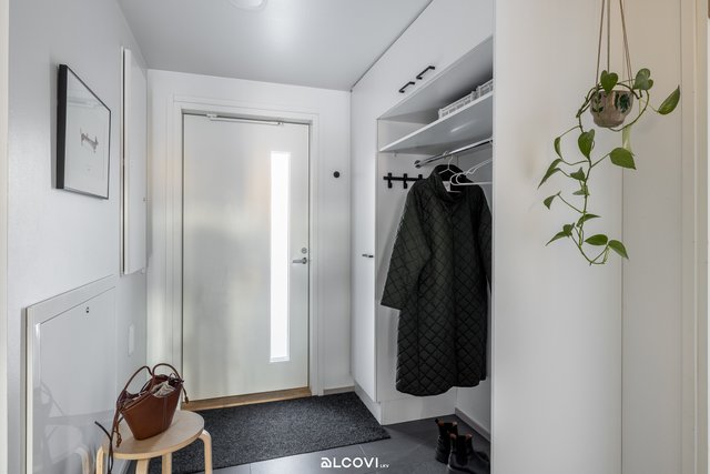 - Eteisen lattia on osin laattaa, osin laminaattia, seinät maalatut. Kiintokaapistoa avonaulakolla. Lattialämmitys (vesikiertoinen).