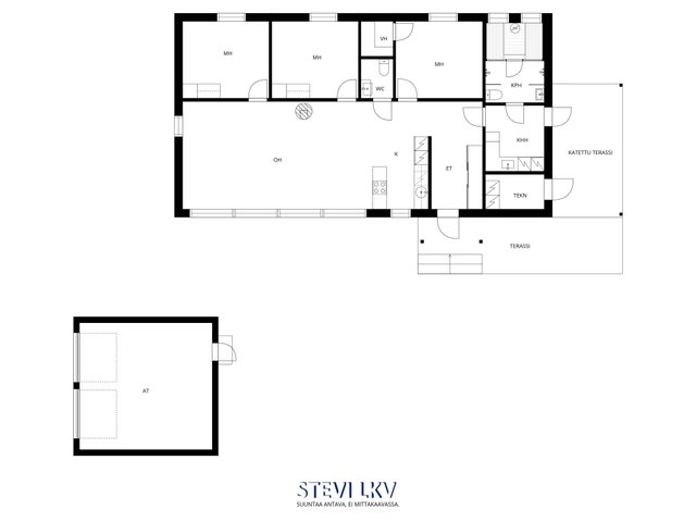 - Lämmin varasto / tekninen huone. Lisäksi kahden auton autotalli.