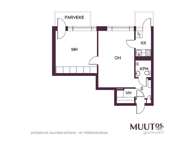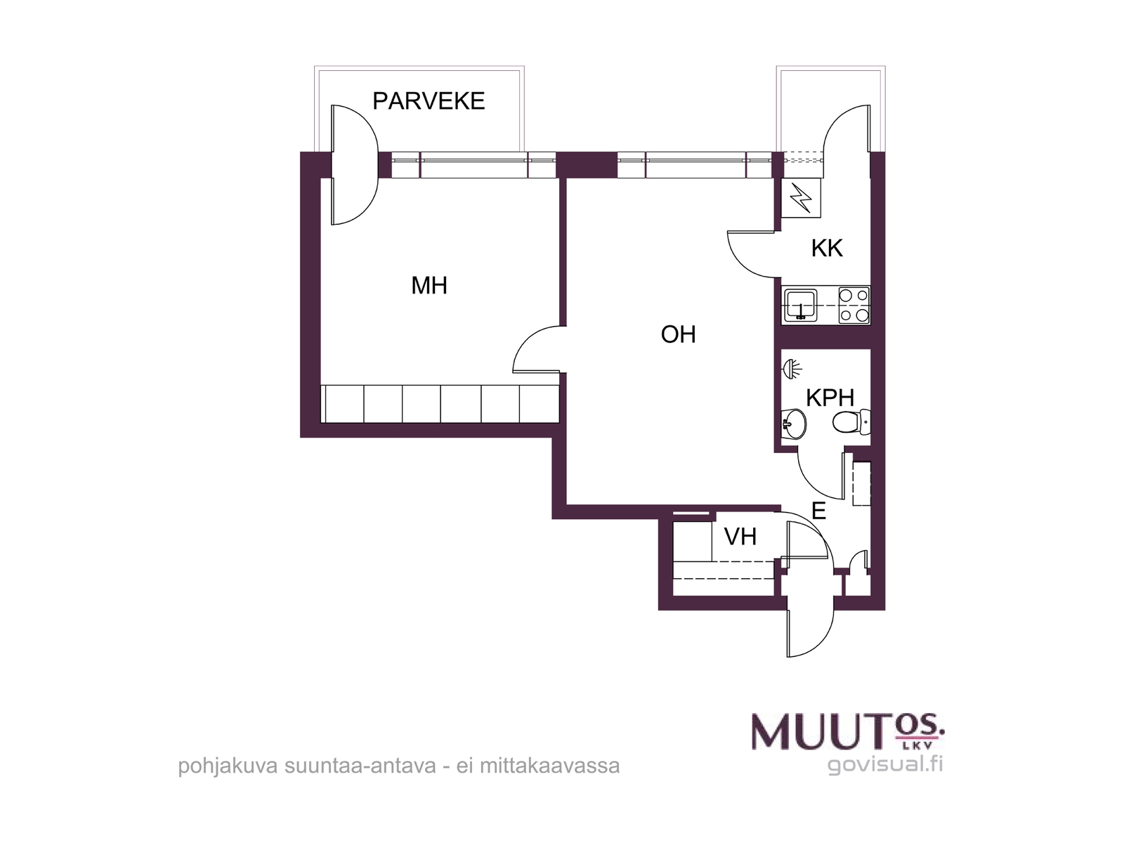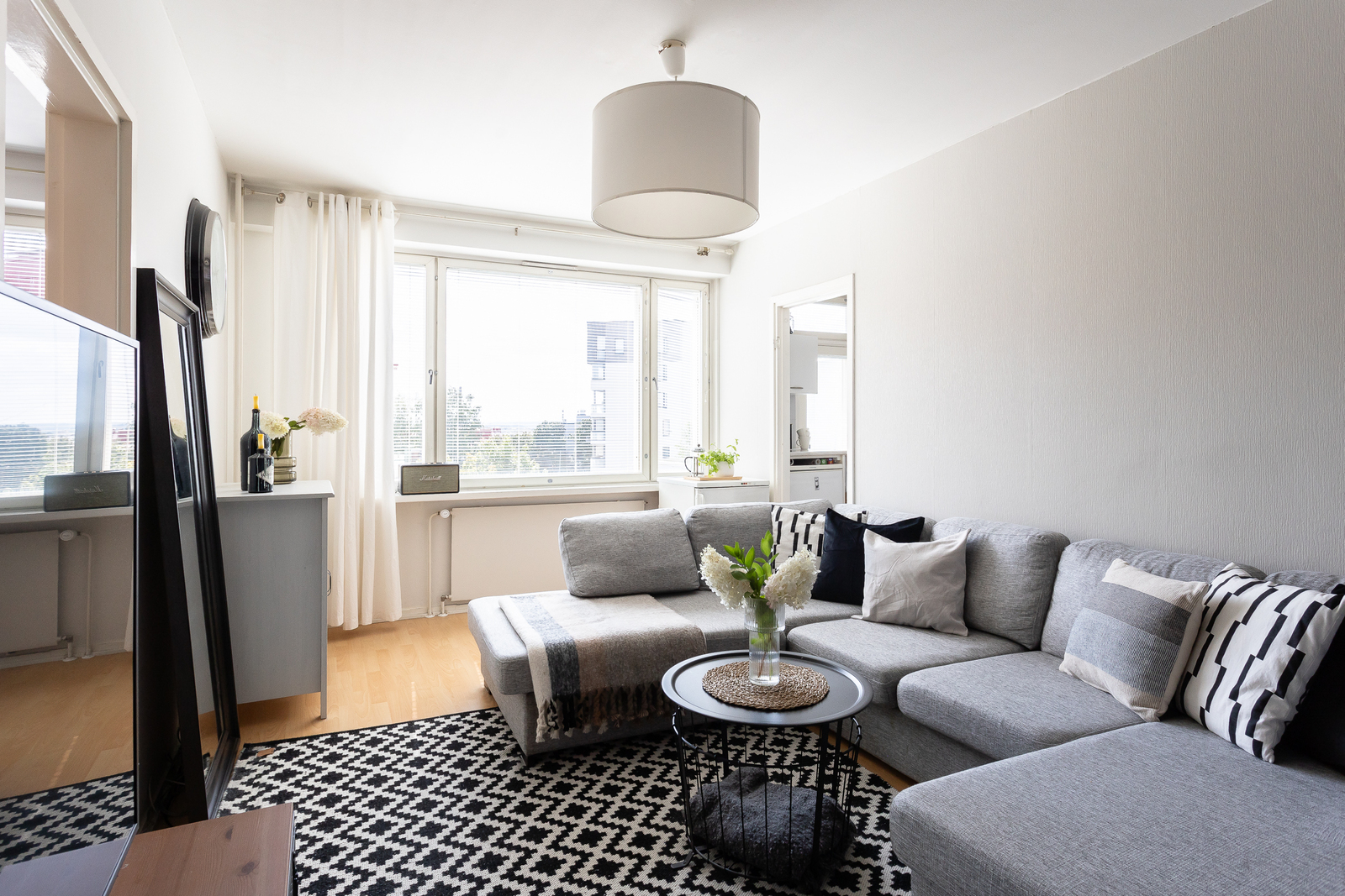 Tässä siistissä kodissa on toimiva pohjaratkaisu ja suuret ikkunat tekevät siitä valoisan. Keittiö ja olohuoneen välinen seinä on mahdollista avata ja tehdä kokonaisuudesta nykytrendin mukaisesti yhtenäisen tilan. Makuuhuoneessa on koko seinän pituudelta kaapistot ja käynti toiselle parvekkeelle. Toiselle parvekkeelle pääsee keittöstä. Kylpyhuone on kauttaaltaan laatoitettu ja sinne sopii pesukone.