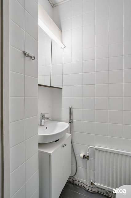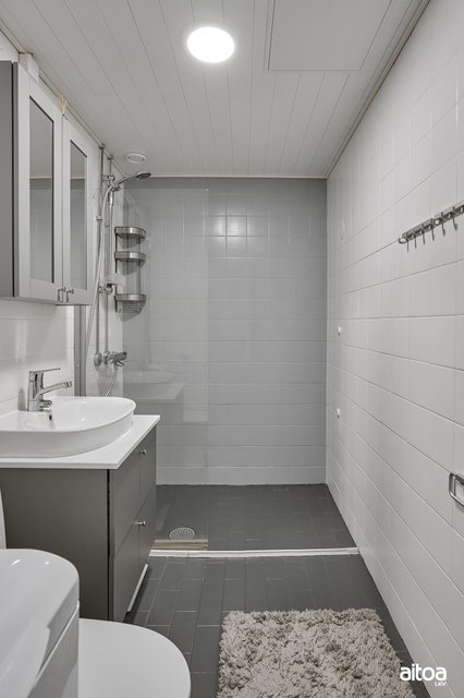 - Peilikaappi, pesuallas, allaskaappi, bideesuihku, wc-istuin, suihkuseinä, suihku, pk-liitäntä, pyyhekuivain.
